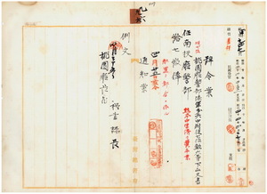 九六 南投庁長久保通猷ト桃園庁長西美波ノ内申ニ依リ桃園庁警部陸軍歩兵中尉下山又喜ヲ南投庁警部ニ任ス