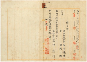一〇五 台北庁長井村大吉ノ内申ニ依リ台湾総督府国語学校教諭及川優曹ニ崔崢公学校教諭職務取扱ヲ命シ、台湾総督府国語学校訓導林済川ニ崔崢公学校訓導職務取扱ヲ命シ(四月一四日付内申)、並ニ台湾総督府国語学校教諭倉岡一雄ニ崔崢公学校教諭職務取扱ヲ命ス(四月一七日付内申)
