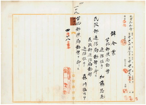 一〇八 台湾総督府民政部通信局長事務取扱鈴木三郎ノ内申ニ依リ台北郵便局勤務台湾総督府通信技手加藤忠亮ニ民政部通信局勤務ヲ命シ、民政部通信局勤務台湾総督府通信技手森川猛次郎ニ台北郵便局勤務ヲ命ス