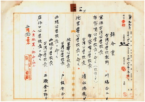 一二 嘉義庁長津田毅一ノ内申ニ依リ樸仔脚公学校勤務台湾公学校教諭川端正二ニ台湾公学校長ヲ兼任シ布袋嘴公学校勤務ヲ命シ、布袋嘴公学校勤務台湾公学校教諭兼校長清水徳蔵ニ他里霧公学校長ヲ命シ、他里霧公学校勤務台湾公学校教諭兼校長戸板守正ニ西螺公学校長ヲ命シ、西螺公学校勤務台湾公学校教諭兼校長三瀬金十郎ニ店仔口公学校長ヲ命ス
