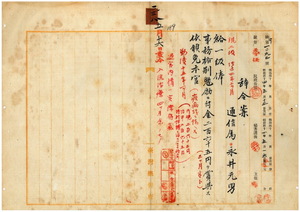 三八 台湾総督府通信属永井元男ハ疾病ニ罹リ職ニ堪ヘサル旨ヲ以テ辞職願ニ依リ昇級ノ上事務格別勉励ニ付キ一時金ヲ賞与シ本官ヲ免ス