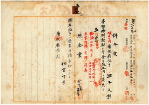 五七 南投庁長久保通猷ノ稟申ニ依リ兵役服務中落馬負傷シテ除隊シ任官後再発シ劇痛頻発ニテ到底職ニ堪ヘサル旨ヲ以テ辞職願出タル南投庁技手瀧本文静ニ事務格別勉励ニ付キ一時金ヲ賞与ス