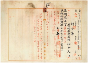 一五 台南庁長松本茂俊ノ内申ニ依リ雲掩臼支庁勤務台南庁警部補松本元治ハ疾病ニ罹リ職ニ堪ヘサル旨ヲ以テ辞職願ニ依リ本官ヲ免シ事務格別勉励ニ付キ一時金ヲ賞与ス