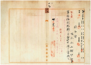 一九 台湾総督府民政部蕃務本署長大津麟平ノ内申ニ依リ蕃地医務嘱託トシテ蕃地ニ出張中熱帯赤痢ニ侵サレ辞職ヲ願出タル蕃務本署勤務嘱託小山輔伊智ニ事務格別勉励ニ付キ一時金ヲ賞与ス