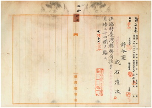 二二 臨時台湾糖務局長内田嘉吉ノ内申ニ依リ阿緱庁庶務課勤務雇武石清次ヲ臨時台湾糖務局技手ニ任ス