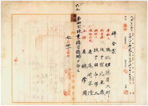 六三 台湾総督府民政部殖産局長高田元治郎ノ内申ニ依リ嘱託伊藤貞次郎、技手ノ宮北米蔵・田中市二、雇ノ尾崎宗隆・林学周ニ第四回林業講習講師ヲ命ス