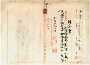 七〇 新竹庁長家永泰吉郎ノ内申ニ依リ苗栗支庁長新竹庁警部岩村一哉ニ支庁長勤務中加俸月俸一〇分ノ七ヲ給ス