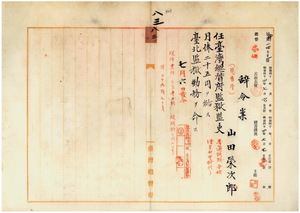 八三 台北監獄長台湾総督府典獄志豆機源太郎ノ内申ニ依リ台北監獄看守山田栄次郎ヲ台湾総督府監獄監吏ニ任シ台北監獄勤務ヲ命ス