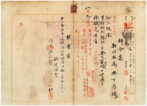 一一 新竹庁属木下秀儀ハ麻剌利亜ニ罹リ職ニ堪ヘサル旨ヲ以テ辞職願ニ依リ昇級ノ上事務格別勉励ニ付キ一時金ヲ賞与シ本官ヲ免ス