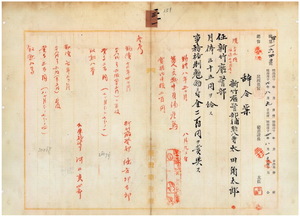 三一 新竹庁長家永泰吉郎ノ電報内申ニ依リ敵蕃ト交戦中重傷ヲ負ヒ危篤トナリタル新竹庁警部補太田角太郎ヲ新竹庁警部ニ任シ増俸ノ上事務格別勉励ニ付キ一時金ヲ賞与ス