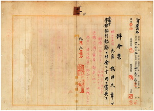 二一 台湾総督府民政部内務局長亀山理平太ノ内申ニ依リ元雇武田久章ニ在職中事務格別勉励ニ付キ一時金ヲ賞与ス
