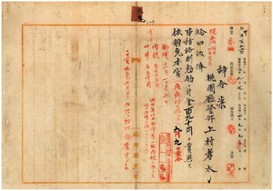 二九 桃園庁大嵙崁支庁勤務桃園庁警部上村孝太ハ疾病ニ罹リ職ニ堪ヘサル旨ヲ以テ辞職願ニ依リ昇給ノ上事務格別勉励ニ付キ一時金ヲ賞与シ本官ヲ免ス