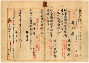 六一 台北郵便局長伊藤金弥ノ内申ニ依リ台北郵便局郵便課勤務通信事務員前田龍馬ヲ台湾総督府通信属ニ任シ台北郵便局勤務ヲ命シ、大稲花郵便出張所勤務台北郵便局通信助手生川重次郎ヲ台湾総督府通信手ニ任シ台北郵便局勤務ヲ命ス