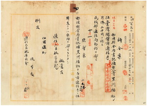 四 台湾総督府民政部通信局長心得角源泉ノ内申ニ依リ逓信省郵便貯金局勤務郵便貯金局書記補黒川福松ヲ台湾総督府通信手ニ任シ台湾総督府民政部通信局勤務ヲ命ス
