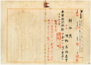 二三 台湾総督府民政部殖産局長高田元治郎ノ具申ニ依リ解嘱トナル蘇澳ニ於ケル漁船関丸監督及ヒ会計事務嘱託宜蘭庁巡査東郷嘉吉ニ事務格別勉励ニ付キ一時金ヲ賞与ス