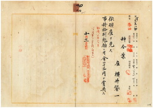四〇 台湾総督官房秘書課勤務台湾総督府雇横井澀一ハ疾病ニ羅リ職ニ堪ヘサル旨ヲ以テ辞職願ニ依リ雇ヲ免シ事務格別勉励ニ付キ一時金ヲ賞与ス
