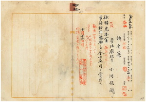四三 台北庁技手小河俊蔵ハ疾病ニ罹リ職ニ堪ヘサル旨ヲ以テ辞職願ニ依リ本官ヲ免シ事務格別勉励ニ付キ一時金ヲ賞与ス、但シ内実ハ実業ニ従事スル為メナリ
