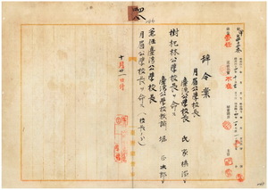 四八 新竹庁長家永泰吉郎ノ内申ニ依リ月眉公学校長台湾公学校長氏家槇治ニ樹砥林公学校長ヲ命シ新竹公学校勤務台湾公学校教諭堀正次郎ヲ台湾公学校長月眉公学校長ニ兼任ス