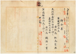 五六 台湾総督府民政部通信局長心得角源泉ノ内申ニ依リ宜蘭郵便局長台湾総督府通信属松尾宗幽ニ民政部通信局勤務ヲ命シ、基隆郵便局勤務台湾総督府通信属楠瀬一貫ニ宜蘭郵便局長ヲ命ス