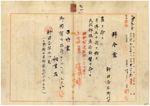 七一 台湾総督府民政部殖産局長高田元治郎ノ具申ニ依リ澱粉製造教師トシテ必要ニ付キ新田正右衛門ニ雇ヲ命シ民政部殖産局勤務ヲ命ス