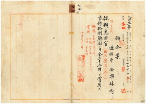 七四 淡水郵便局長小野塚斧太郎ノ内申ニ依リ淡水郵便局勤務台湾総督府通信手安楽休内ハ徴兵応召ノ為メ退官願ニ依リ本官ヲ免シ事務格別勉励ニ付キ一時金ヲ賞与ス