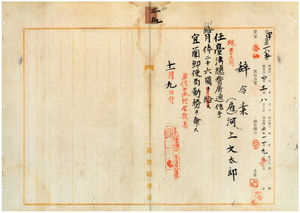 三五 宜蘭郵便局長楠瀬一貫ノ内申ニ依リ宜蘭郵便局通信事務員河上文太郎ヲ台湾総督府通信手ニ任シ宜蘭郵便局勤務ヲ命ス