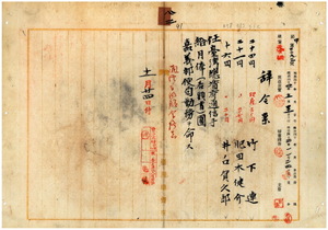 八二 嘉義郵便局長桜井貞光ノ内申ニ依リ嘉義郵便局通信事務員竹下連及ヒ嘉義郵便局通信助手兼通信事務員ノ肥田木健介ト井ノ口賀久郎ヲ台湾総督府通信手ニ任シ嘉義郵便局勤務ヲ命ス