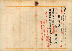 九〇 台湾総督府民政部殖産局園芸試験場勤務台湾総督府雇和田耕助ハ脚気ニ罹リ職ニ堪ヘサル旨ヲ以テ辞職願ニ依リ雇ヲ免シ事務格別勉励ニ付キ一時金ヲ賞与ス
