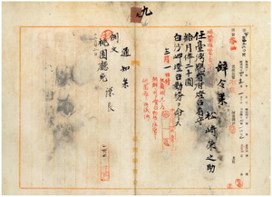 九 台湾総督府民政部通信局長心得角源泉ノ内申ニ依リ大嵙崁支庁勤務桃園庁巡査松崎栄之助ヲ台湾総督府灯台看守ニ任シ白沙岬灯台勤務ヲ命ス