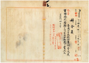 一三 台北庁長井村大吉ノ内申ニ依リ疾病ニ罹リ職ニ堪ヘサル旨ヲ以テ辞職ヲ願出タル台湾小学校教諭青柳壱伎英ニ事務格別勉励ニ付キ一時金ヲ賞与ス