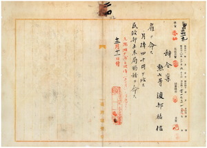 二四 台湾総督府民政部土木局長事務取扱代理高橋辰次郎ノ内申ニ依リ元賀田組事務員渡辺祐信ニ台湾総督府雇ヲ命シ民政部土木局勤務ヲ命ス