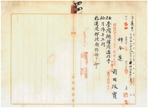 四四 花蓮港郵便局長大津延吉ノ内申ニ依リ花蓮港郵便局勤務花蓮港郵便局通信助手兼通信事務員前田俊実ヲ台湾総督府通信手ニ任シ花蓮港郵便局勤務ヲ命ス