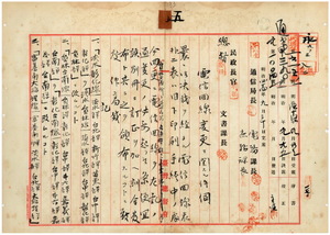 五 曩ニ決裁ヲ経印刷シツツアル電信回線表外二表ニ付、今回員林出張所ト淡水局間ニ直通線ガ設ケラレ且ツ電信回線変更サレタルニ付キ別冊ニ訂正ヲ加ヘ訓令発布ト共ニ頒布シ、明治三六年八月訓令第一五七号ヲ以テ改定セラレ爾来屡々追加改正ヲ加ヘタル電信回線表・電報中継順路表・局報順送表改定並ニ訓令第一五七号廃止ノ件(訓令第一七四号)