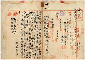 一二 台湾総督府民政長官ヨリ本島外ニ搬出スル大甲帽及林投帽ニ対シ其粗製濫造ヲ防遏センカ為メ総督府ノ事業トシテ全島ニ亙リ各地ニ帽子検査所ヲ開設シ統一アル検査ヲ施行スルヲ以テ帽蓆同業組合ニ関スル庁令ヲ明治四四年ヨリ廃止及ヒ該組合解散ニ関シ台中及ヒ新竹両庁長ヘ通達ノ件