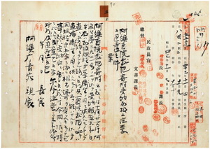 五 阿緱庁長佐藤謙太郎ヨリ土地受納ニ付キ報告ノアリタル阿緱医院敷地トシテ童頂・童氏却・王漏猜・許呆銭・王年魁・王進成・林石于・陳嘆・林進宝・方鄒旺・曽順・陳溯其・許宗朝・許能吉・湯有明・湯草・林和・林王・曽朝允ヨリ阿緱庁港西中里阿緱街ノ建物敷地・畑ノ寄附ヲ受ケタルニヨリ受納シタル件ニ付キ本件ハ取扱規程第一条衛生ノ用ニ供スルモノトシテ阿緱庁ハ直ニ受納シタルモ医院敷地ノ如キハ直接衛ノ用ニ供スルモノト云フ能ハサルヲ以テ同取扱規程第五条ニ依リ相当認可ヲ受クヘキモノナルモノニシテ手続上過誤アリタルモノナルガ既ニ受納