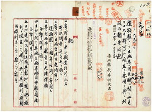 七 簡春塘、亡簡廷槐相続人簡単祷架、亡簡春錦相続人簡灌努、亡王鐘芳相続人王唐虞・王啓勝、楊阿連、楊求、張金炎、亡張茂才相続人張氏巧、曽万、曽英・曽桂、陳恩培、朱煥奎、曹讃、陳茂章、曹永份、曹天和、陳紅九ヨリ台北庁芝蘭一堡士林街ノ田・畑・建物敷地ヲ道路敷地トシテ寄附出願許可ニ付キ台北庁長井村大吉ヨリ報告ノ件
