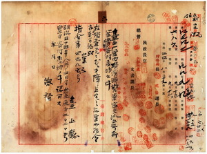 六 台北庁長井村大吉ヨリ稟申ノ台北庁金包里支庁来渓頭警察官吏派出所新築ニ関シ陳在廷・□栄老・□丹道・□波外ヨリ金員並ニ労力及ヒ簡石賜・簡金砥・簡新茂・□治・□□利ヨリ台北庁金包里堡頂角庄土名来渓頭ノ建物敷地ヲ同派出所敷地トシテ寄附受納出願方認可ノ件(指令第四六九六号)