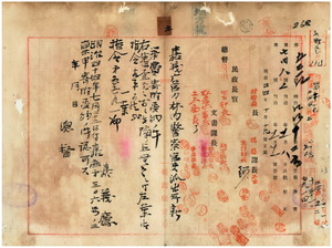 五 嘉義庁長津田毅一ヨリ稟申ノ嘉義庁管内ニ工場ヲ有スル兵庫県加古郡高砂町籃町ノ合資会社三菱製紙所副支配人藤野懿造及ヒ嘉義庁斗六堡林内庄人民総代林聖・鄭能智等庄民三八〇名ヨリ出願ノ嘉義庁斗六支庁内警察官吏派出所新築費寄附受納ニ付キ認可ノ件(指令第五五九一号)