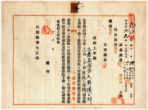 五 元嘉義庁属大野儀三郎ヘマラリヤニ罹リ職ニ堪ヘサル旨ヲ以テ退官ニ付キ恩給証書下付及同証書送付ノ件