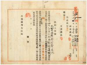 一七 元新竹庁警部古賀文也ヘ新竹庁隘勇線ニテ勤務中蕃人ノ狙撃ヲ受ケ負傷セシ回復ノ見込ナキニヨリ退官ニ付キ恩給証書下付及証書送付ノ件