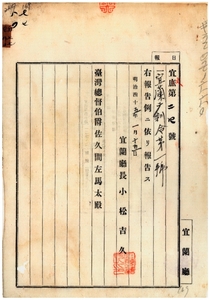 七七 第一号 明治四四年一月宜蘭庁訓令第四号明治四二年一二月台湾総督府訓令第二〇八号台湾総督府報告例目主管別中改正ノ件