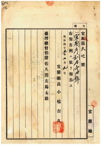 宜蘭廳訓令第四號蕃地警察職務規程施行細則ニ依ル巡查巡查補ノ巡邏度數ヲ定ム
