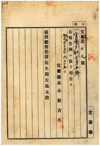 一〇二 第五号 明治四三年一二月宜蘭庁訓令第三三号隘勇監督所以下名称及担任区域改正ノ件