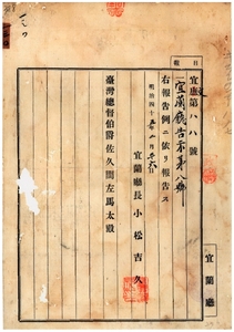 一三〇 第八号 明治三七年二月宜蘭庁告示第一三号ヲ以テ認定ノ公共課嘩金大安嘩及ヒ認定外課嘩鼻仔頭嘩ト隘佃嘩ヲ合併シ宜蘭庁第四公共課嘩トシテ認定シ其ノ区域ヲ制定スルノ件