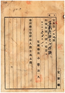 一三二 第一〇号 宜蘭庁員山堡内員山庄楊成・同堡結頭け庄薜和尚・本城堡宜蘭街蔡清水・同堡同街張審燕ノ煙草小売営業鑑札紛失ニ付キ該鑑札ヲ無効トス