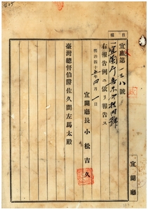 宜蘭廳告示第十四號臺北廳艋舺凹仔街ニ豚虎列剌發生通知