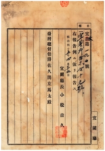 宜蘭廳告示第十九號阿片煙膏購買吸食特許鑑札并通帳亡失ノ旨臺中廳通知