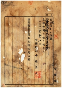 一四六 第二四号 宜蘭庁頭囲堡抜雅林庄土名武営呉最ノ煙草小売営業鑑札紛失ニ付キ該鑑札ヲ無効トス