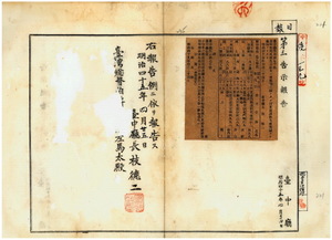 一七二 第七〇号 花蓮港庁蓮郷花蓮港街陳木火・台南庁学甲堡北門嶼庄洪祥・同庁大竹里旗后街許白ノ支那形船新徳興及ヒ同庁効忠里安平街山内恕ノ日本形船三号ト一一号ノ船鑑札流失及紛失ニ付キ無効ノ旨花蓮港庁及ヒ台南庁ヨリ通知ノ件