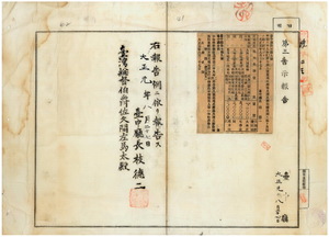 九 第九号 明治三九年二月府令第八号墓地火葬場及埋火葬取締規則ニ依リ台中庁管内ノ大南庄共同墓地、七け庄水井仔共同墓地、大南庄番社嶺共同墓地・馬力埔庄共同墓地許可ノ件南投庁・嘉義庁・阿緱庁ノ庁令供閲ノ件